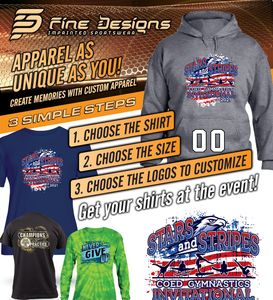 FREE: Every Gymnast receives a FREE Commemorative Stars & Stripes Event T-Shirt. Gymnasts can claim their T-Shirt in the Awards area. Gymnasts can also 'up-grade' their T-Shirts to Sweat shirts / Hoodies or add additional images! They have some really cool stuff!!!